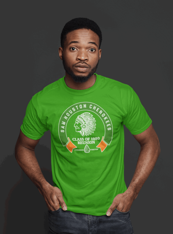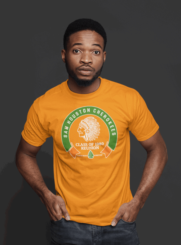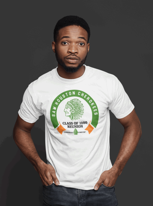 “Join us in celebrating the ‘Sam Houston Cherokee Class of 1980 Reunion’ with a selection of T-shirts available in various colors.” It’s straightforward: place your order, and we will ensure it is shipped directly to you in time for your class reunion.